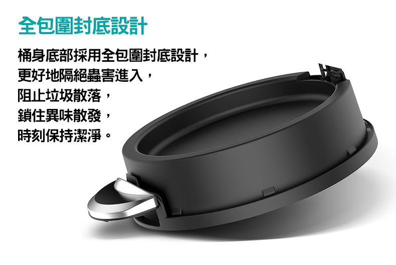 *靜音緩降閉合技術*一體式人體力學腳踏板*桶蓋提手設計*保持開蓋*抗菌防指紋塗層*甄選410不銹鋼*垃圾袋鎖圈*隱藏提手*全包圍底座